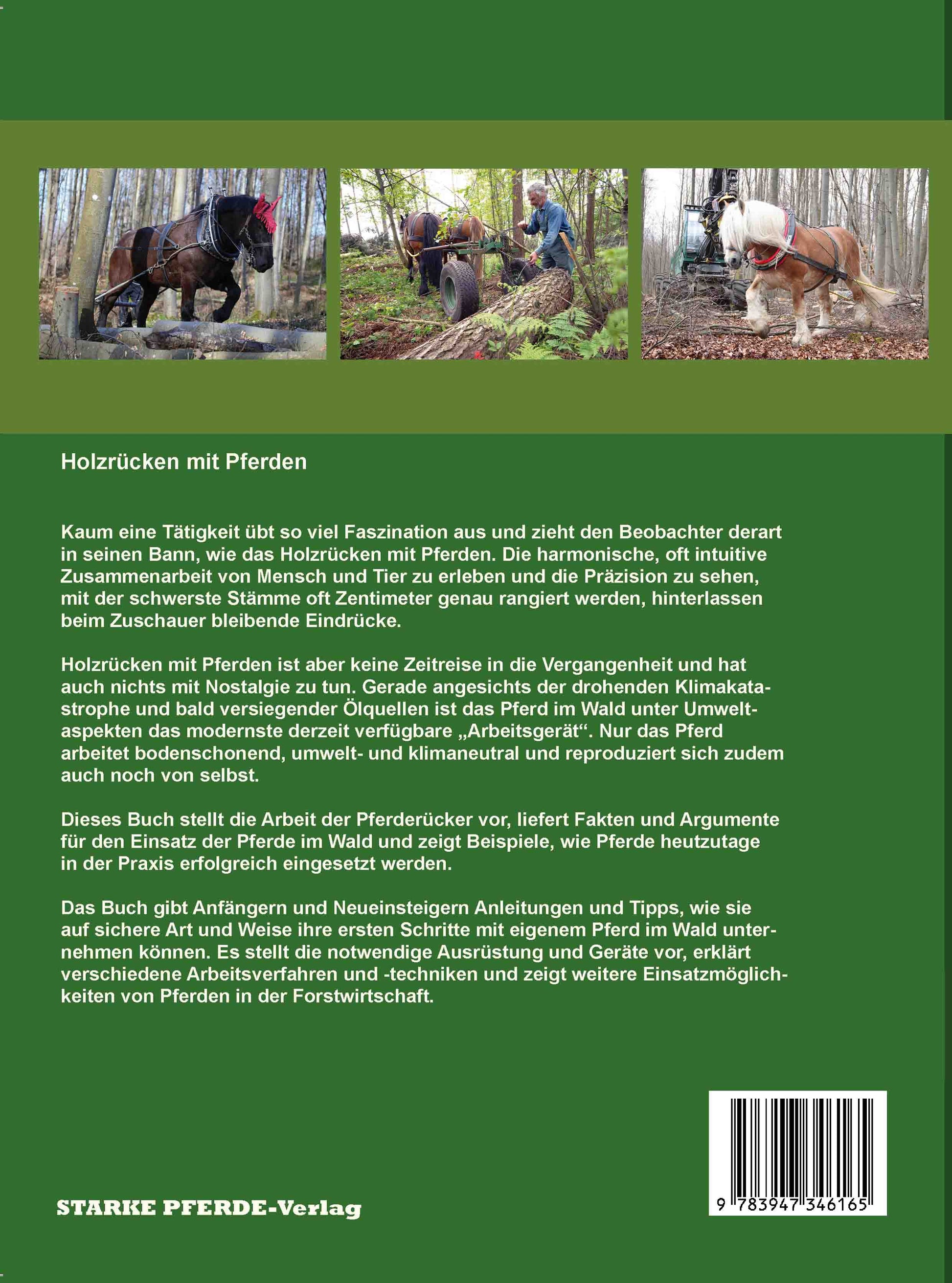 Kaum eine Tätigkeit übt so viel Faszination aus und zieht den Beobachter derart in seinen Bann wie das Holzrücken mit Pferden. Die harmonische, oft intuitive Zusammenarbeit von Mensch und Tier zu erleben und die Präzision zu sehen, mit der schwerste Stämme oft Zentimeter genau rangiert werden, hinterlassen beim Zuschauer bleibende Eindrücke. Holzrücken mit Pferden ist aber keine Zeitreise in die Vergangenheit und hat auch nichts mit Nostalgie zu tun. Gerade angesichts der drohenden Klimakatastrophe und bald versiegender Ölquellen ist das Pferd im Wald unter Umweltaspekten das modernste derzeit verfügbare "Arbeitsgerät". Nur das Pferd arbeitet bodenschonend, umwelt- und klimaneutral und reproduziert sich zudem auch noch selbst. Dieses Buch stellt die Arbeit der Pferderücker vor, liefert Fakten und Argumente für den Einsatz der Pferde im Wald und zeigt Beispiele, wie Pferde heutzutage in der Praxis erfolgreich eingesetzt werden. Das Buch gibt Anfängern und Neueinsteigern Anleitungen und Tips, wie sie auf sichere Art und Weise ihre ersten Schritte mit dem eigenen Pferd im Wald unternehmen können. Es stellt die notwendige Ausrüstung und Geräte vor, erklärt verschiedene Arbeitsverfahren und -techniken und zeigt weitere Einsatzmöglichkeiten von Pferden in der Forstwirtschaft.